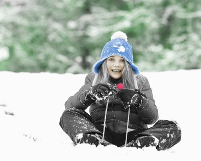 In this image, I used Perlin Noise (to add variance to the tree colors) as well as the Overlay layer blend type and the fill tool to colorize the trees, the hat, the sled handle, and the girl's face.