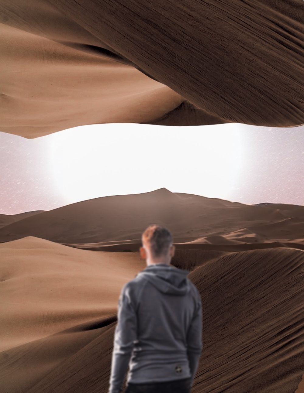 My creative reflection utilized many different techniques to combine largely unrelated images into a final composite. For the first image, the dune, I used Photoshop's Neural Filters, specifically Harmonization, to match the colors to the other dune. I used Pixlr's AI Auto Mask to remove the background. For the person, I used Photoshop's Mask Object (with a bit of manual adjustment) since it seemed to work better than AI Auto Mask, as well as Pixlr's Blur filter to give a sense of focus to the composite. Finally, I used Pixlr's Overlay blend mode and a manually drawn mask to add the stars to the outside of the sun.