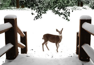 In this image, similar to the last one, I used Perlin Noise (to add variance to the trees) as well as the Overlay and Darken layer blend types, the fill tool, and the magnetic lasso to colorize the trees, the deer, and the fence.